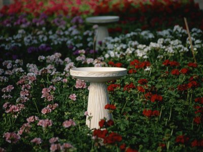 Bird-Baths Surrounded by Colored Geraniums Premium Photographic Poster Print, 30x40 Feature