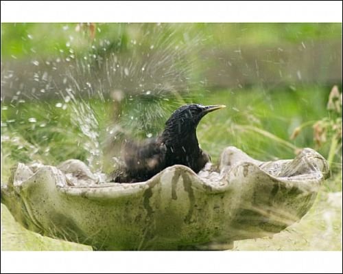 - Photographic Print Title: Various Birds Rest in a Birdbath and on Branches That Hang Above