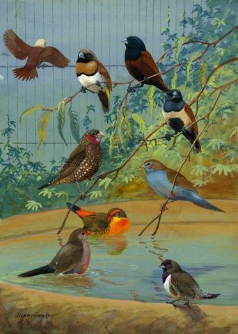 Various Birds Rest in a Birdbath and on Branches That Hang Above Photographic Poster Print by Allan Brooks, 12x16 Review