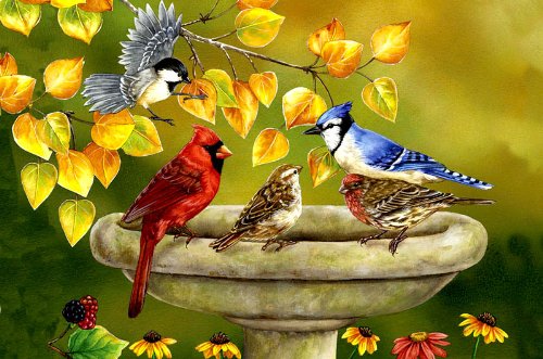 Various Birds Rest in a Birdbath and on Branches That Hang Above Photographic Poster Print by Allan Brooks, 12x16 Feature