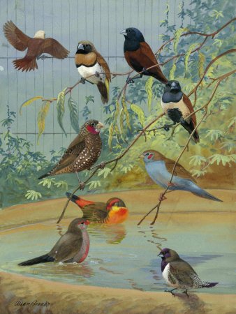 Various Birds Rest in a Birdbath and on Branches That Hang Above Photographic Poster Print by Allan Brooks, 12x16 Feature